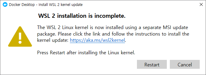 WSL 2 installation is incomplete 창에 Restart 버튼을 다시 클릭
