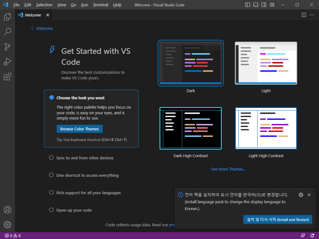위 Finish 버튼을 클릭하면, 아래처럼 Visual Studio Code 첫 실행화면을 볼 수 있음