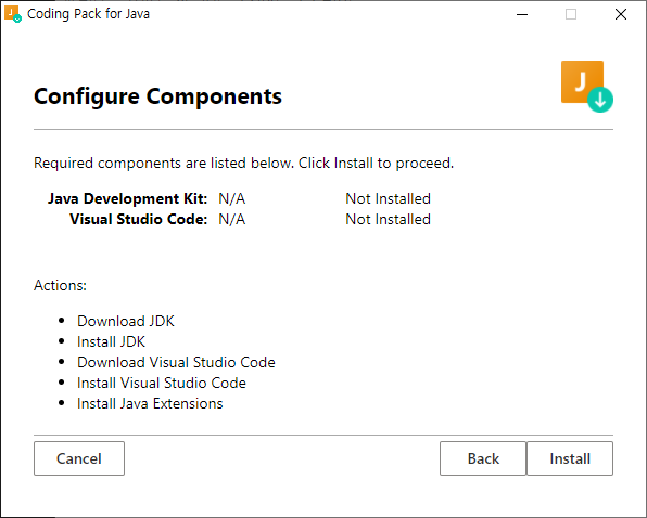 - [ Install the Coding Pack for Java - Windows ] 버튼을 클릭하여 프로그램을 다운로드 받고,